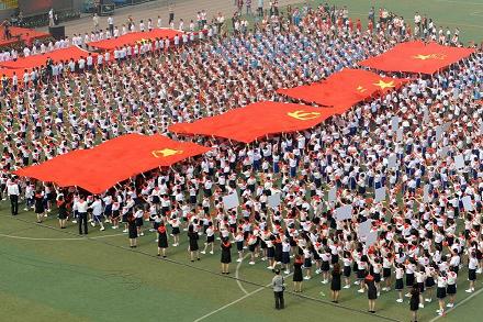 2000余名小學(xué)生排成方陣進(jìn)行“紅色傳遞”,四面長(zhǎng)9米、寬6米的巨幅黨旗、國(guó)旗、團(tuán)旗、隊(duì)旗緩緩從頭頂劃過(guò)。